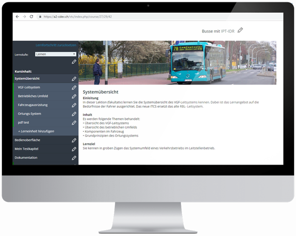 Mit unserer Applikation Virtual Training Center können Sie einfach und intuitiv ihre eigenen Kurse erstellen. Die Kursinhalte können Scorm kompatible Präsentationen, Quizzes, PDFs oder Videos sein.